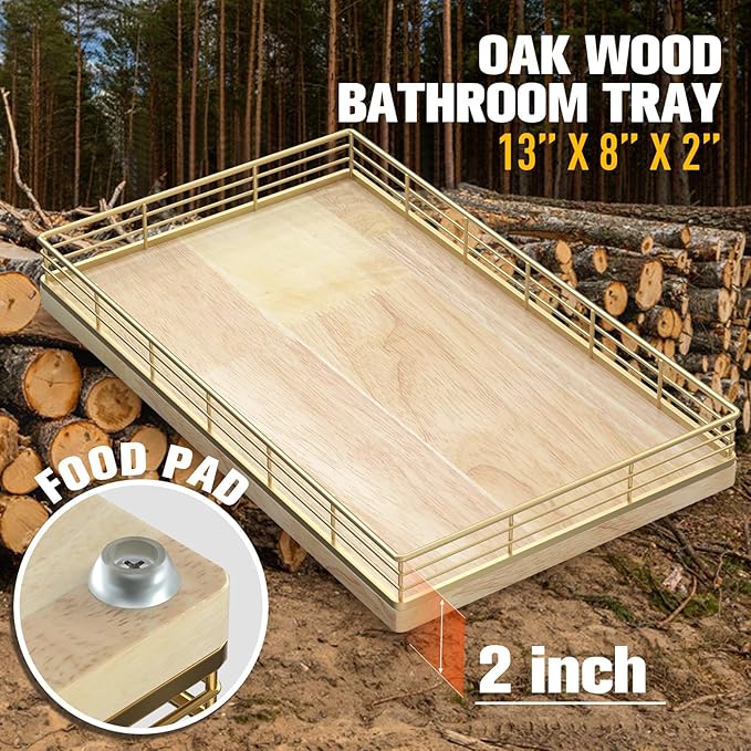 Large Bathroom Vanity Tray – 13" x 8" Oak Decorative Wooden Tray for Bathroom Countertop & Vanity Organizer, Wood Tray for Perfume Skincare Accessories Storage Vanity Dresser Decor Gold & Natural Oak