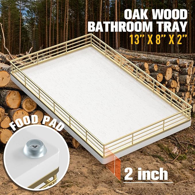 Large Bathroom Vanity Tray – 13" x 8" Oak Decorative Wooden Tray for Bathroom Countertop & Vanity Organizer, Wood Tray for Perfume, Skincare & Accessories Storage, Vanity Dresser Decor Gold & White