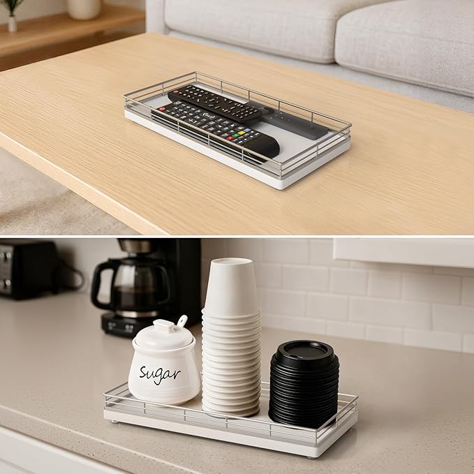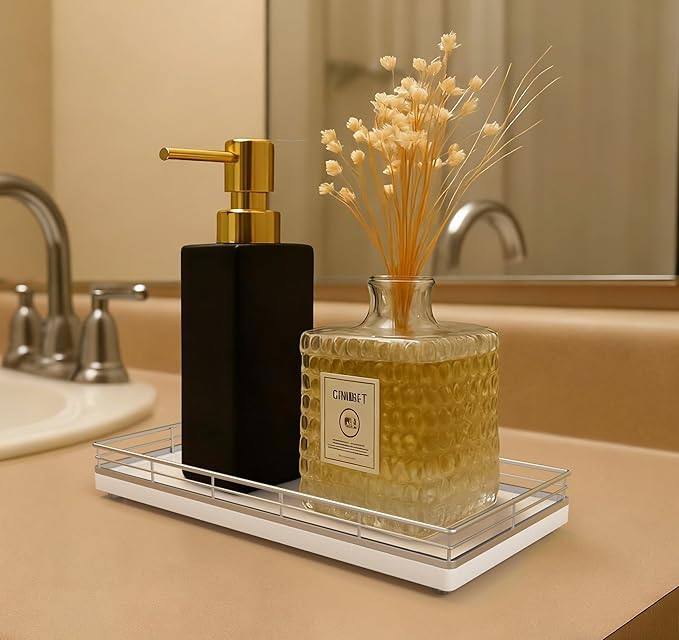- Bathroom Vanity Organizer Tray: Designed as a bathroom counter tray for organizing soap, lotion, perfume, jewelry, and small essentials. Perfect for vanity tops, sink areas, and toilet tank surfaces