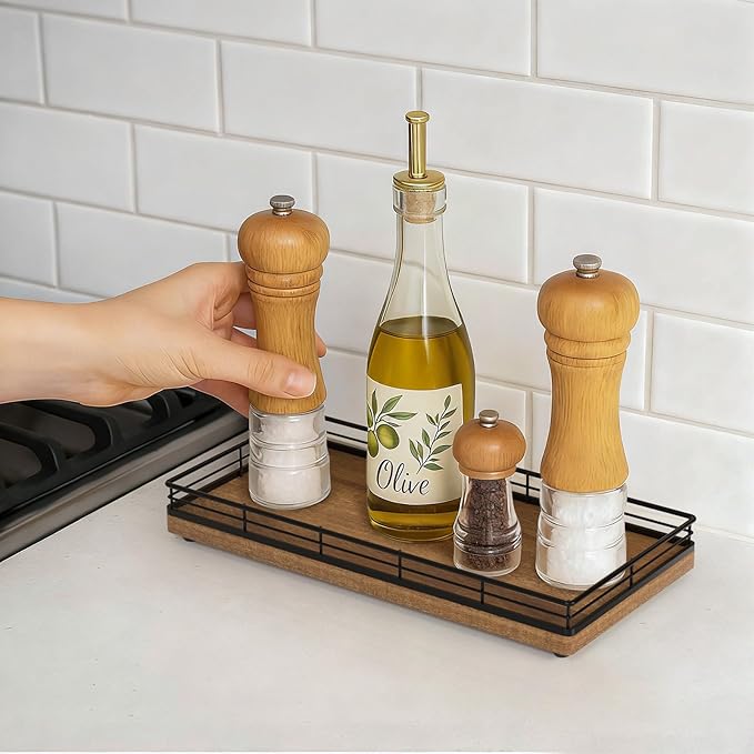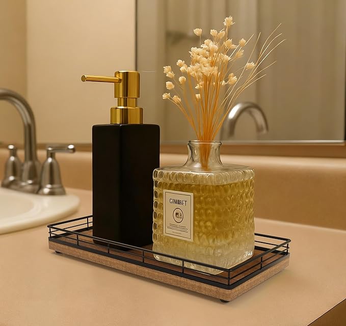 - Elegant Natural Wood & Iron Design: Classic iron-and-wood construction with natural wood grain. Decorative wooden tray that adds warmth and organic style. Sturdy iron frame for durability—ideal for bathroom vanity, countertop, and sink areas