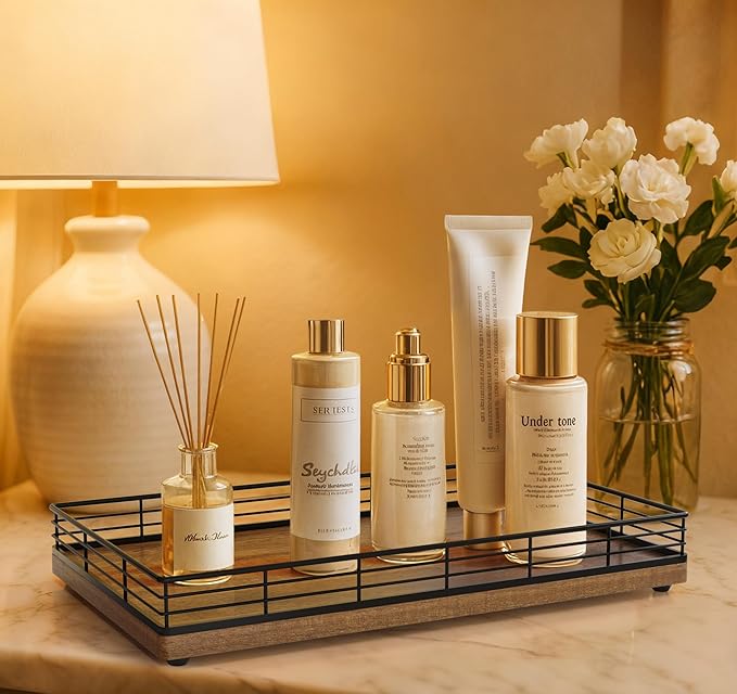 - Larger 13" × 8" Upgraded Size: Designed wider than standard trays, the 13" × 8" surface offers generous space for organizing and displaying essentials. Ideal for perfume bottles, skincare, candles, diffusers, and decorative accents on bathroom vanities or countertops