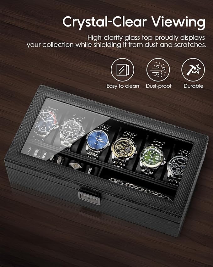 - Clear Glass Lid - Displaying your watches, keeping your watches clean from dust, helping you find your watches and jewelry easier