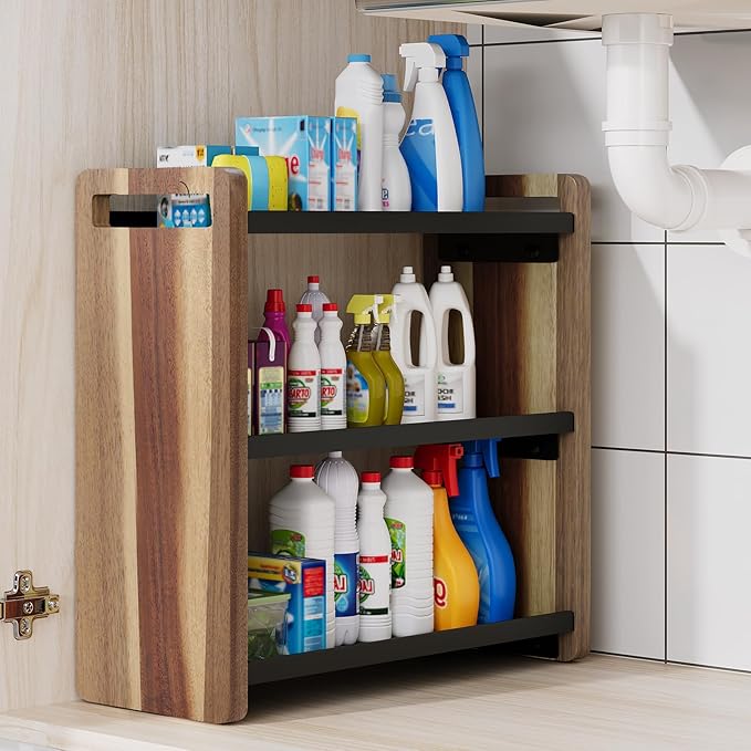 - 💪 Solid Wood Construction for Lasting Durability:Crafted from high-quality, moisture-resistant solid wood, this organizer is built to last. Unlike flimsy plastic organizers, it boasts a heavy-duty design that won't warp or sag over time. It's the sturdy and reliable choice as an under sink organizer for heavy cleaning supplies or a durable cabinet organizer for your kitchen essentials.