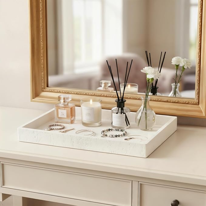 Artificial Travertine Tray, 12"x8" Perfume Tray for Bathroom Counter, Vanity, Home Organizer, Decorative Marble Trays for Perfume, Jewelry, Candles, Coffee, Rectangle, White