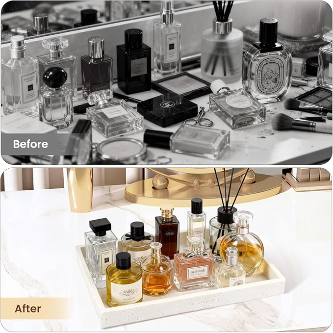 - Material: The perfume tray is made from travertine gravel and resin , not natural travertine . Material advantages: 1. customizable travertine patterns with no color variation or natural imperfections. 2. Exceptionally high abrasion resistance. 3. Strong stain resistance; daily cleaning requires only a damp cloth. 4. Chemically stable structure, resistant to discoloration or deformation.