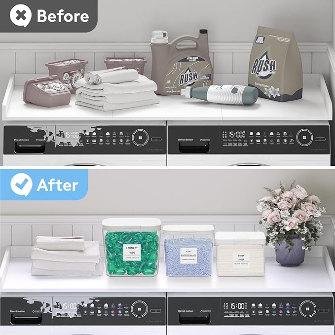 - 2-in-1 Storage Solution with Labels & Scoops: Complete set includes dedicated containers for neatly organising laundry pods, detergents, washing powders, fragrance beads, dryer sheets, and dryer balls. Also comes with practical labels and measuring scoops for a customised laundry station