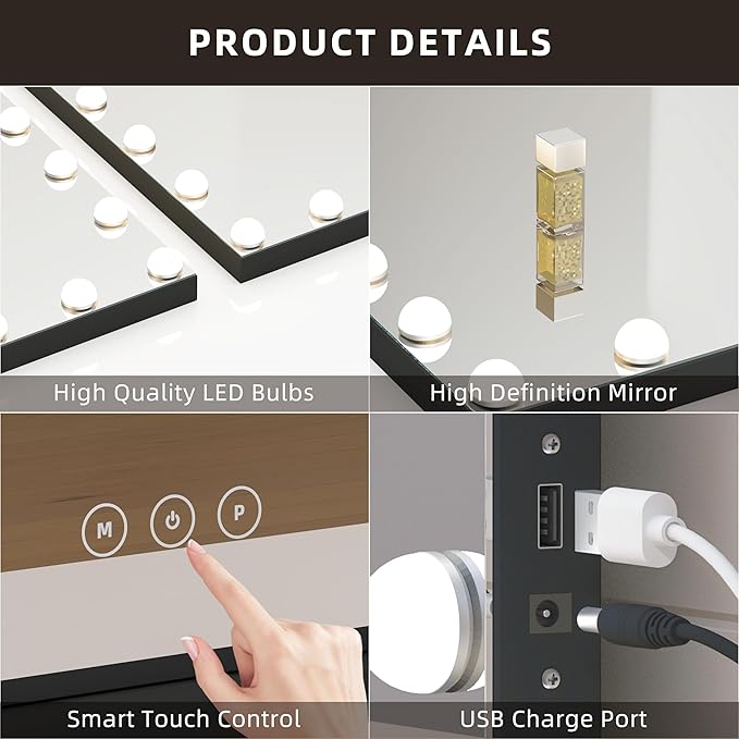 - 【Touch-Sensitive Control & Smart Memory Function】 - Simply turn on/off the light up vanity mirror and adjust the brightness by touching the sensor switch on the screen. Button M can adjust the light modes, button P can adjust the brightness. Intelligent light memory function make you easy to use the suitable light adjusted last time,which helps you get the right natural light, to create your most perfect makeup.