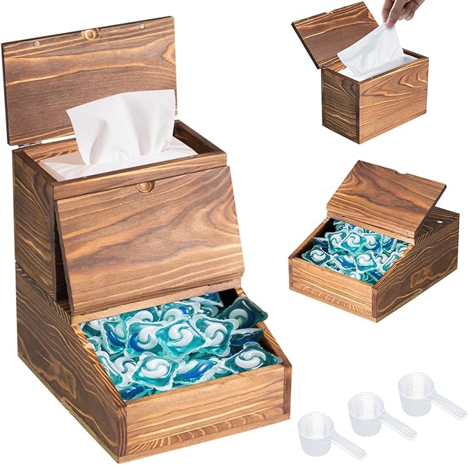 Wooden Laundry Dishwasher Pods Container,Multi-Use Dishwasher Pods Holder & dryer sheet holder, Storage with Spoons for Laundry Room & Kitchen Organization