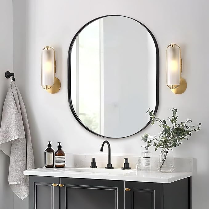 - DURABLE AND SHATTERPROOF: Our pill-shaped mirror boasts exceptional quality, with a rustproof stainless steel frame and a shatterproof 4mm HD glass supported by 9mm MDF backboard. The black oval mirror is recessed, floating in a thin gap within the frame, ensuring longevity and resilience
