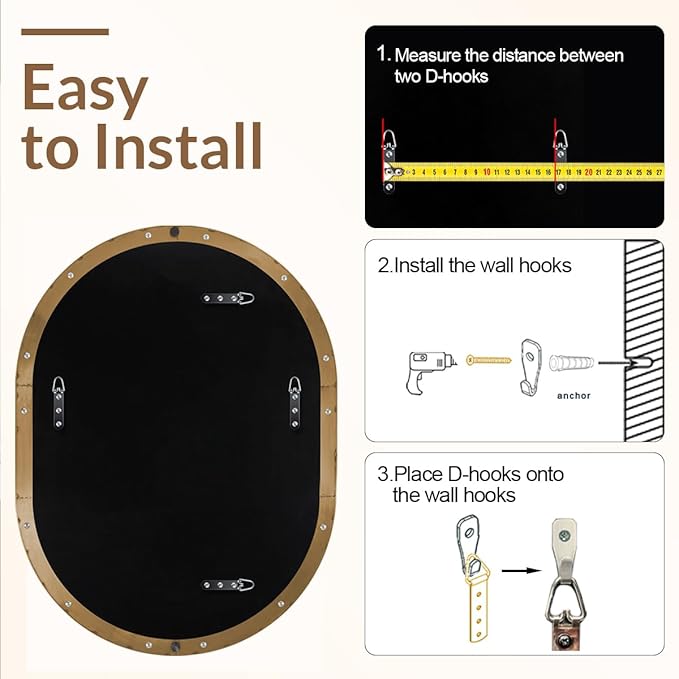 - EASY INSTALLATION: Our nickel oval mirror comes with FOUR reinforced D-Ring hooks and all necessary hardware for easy vertical or horizontal hanging. Heavy mirror, installation with two people is a breeze