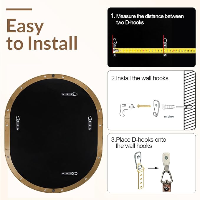 - EASY INSTALLATION: Our brass oval mirror comes with FOUR reinforced D-Ring hooks and all necessary hardware for easy vertical or horizontal hanging. Heavy mirror, installation with two people is a breeze