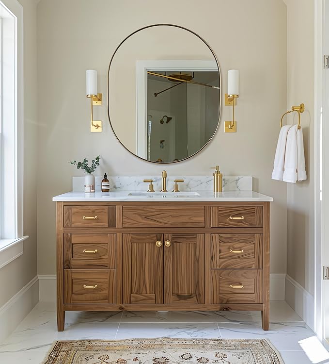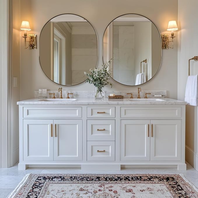 - ELEGANT DESIGN FOR NARROW SPACES: Our gold oval mirror (30 x 36 inch) is perfect for limited spaces thanks to its sleek and simple silhouette. Its brushed gold frame adds a touch of luxury to any room, and the brass color sets it apart from other champagne gold-colored options