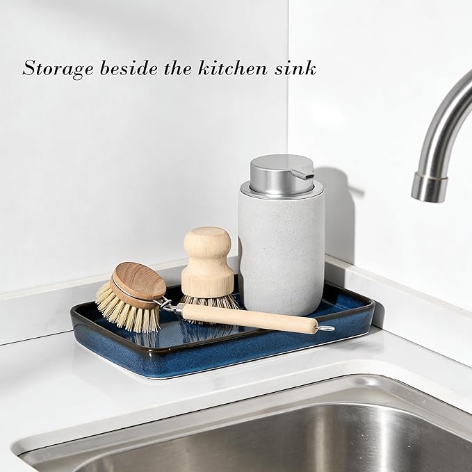 - [Fashion Design Tray for Countertop]-- The kiln-transformed blue countertop tray is the perfect kitchen sink tray for soap bottles, vanity tray, bathroom sink organizer. It’s the perfect soap bottles tray for bathroom.