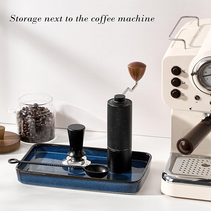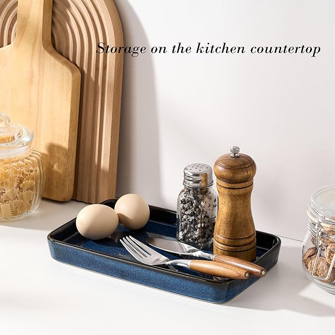 - [Decorative Organizer Tray]-- The tray measures 10"L x 6"W x 1.1"H and is crafted from ceramic material, offering waterproof, stain-resistant, and odor-free properties. Its kiln-transformed blue color design adds a sophisticated, versatile touch, making it an ideal choice for kitchens and home decor. Choose our tray to enhance the warm, high-quality ambiance of your home!