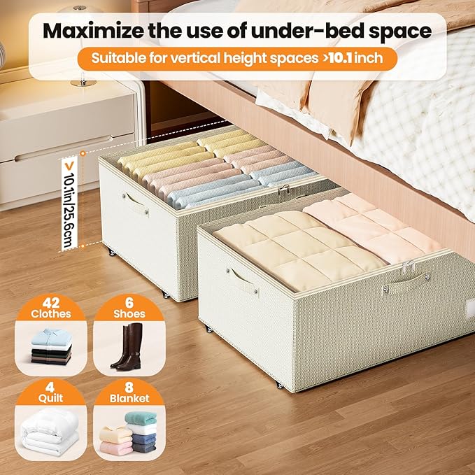 Underbed Storage with Wheels, 2 Pack Under Bed Storage Containers with Clear Lids, No Assembly Required 10.1 inch Rolling Under Bed Storage for Clothes, Beige