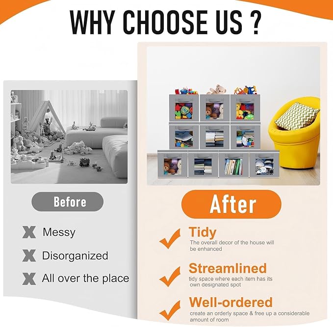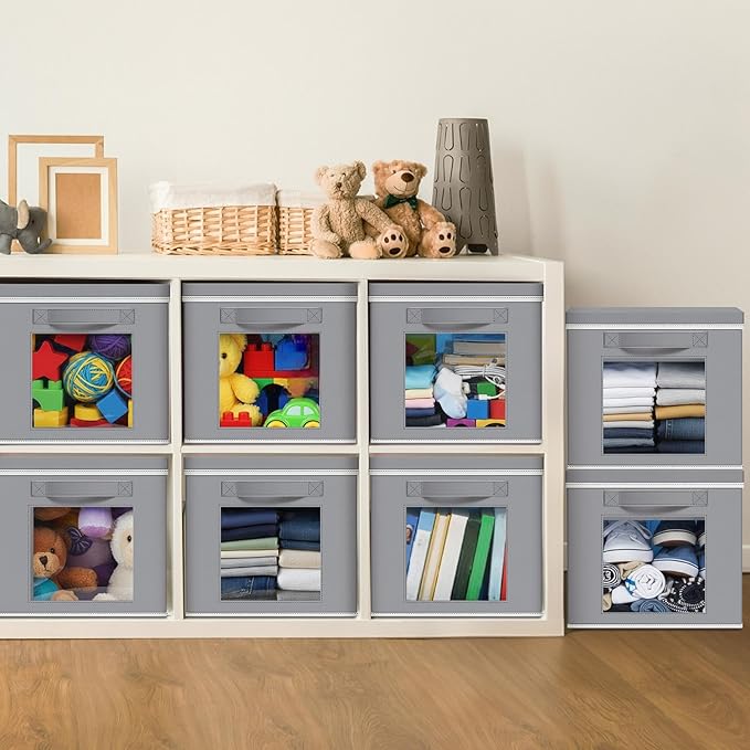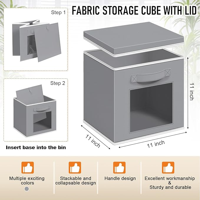 - Classic Tones: you will get 10 pieces light gray fabric cube storage organizers with lid and window, they are 11" L x 11" W x 11" H, the proper size will fit in your cabinets, and blend in with room decor while keeping items orderly