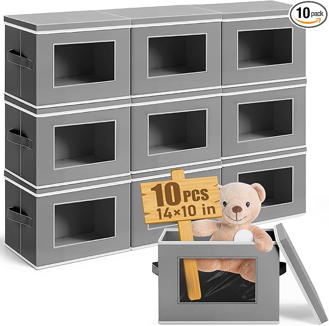 - Classic Tones: you will get 10 pieces dark gray fabric cube storage organizers with lid and window, they are 14" L x 10" W x 10" H, the proper size will fit in your cabinets, and blend in with room decor while keeping items orderly