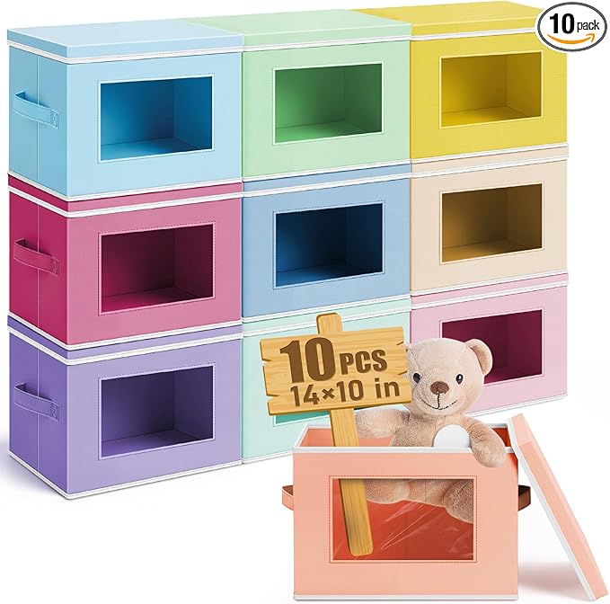 - Colorful Tones: you will get 10 pieces pastel color fabric cube storage organizers with lid and window, they are 14" L x 10" W x 10" H, the proper size will fit in your cabinets, and blend in with room decor while keeping items orderly