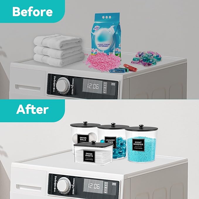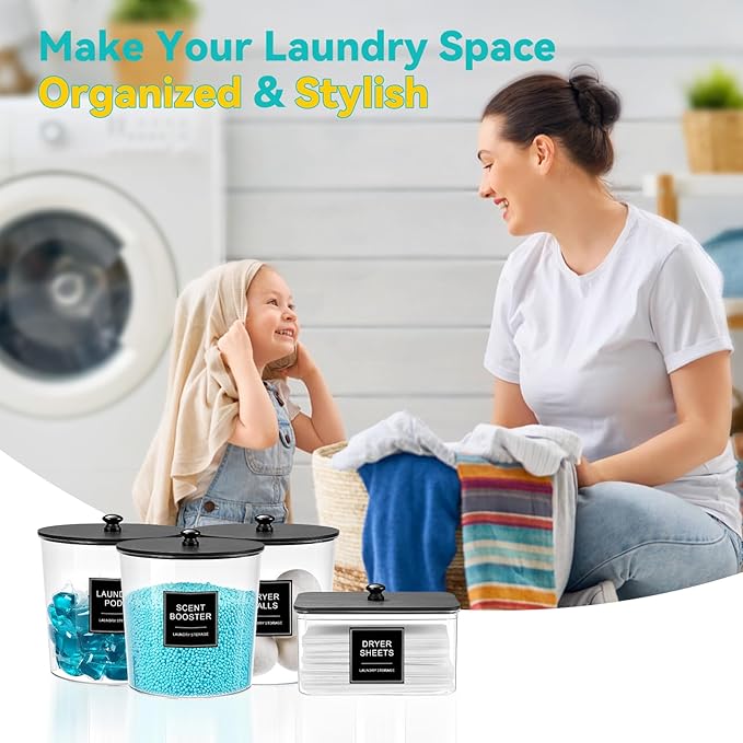 - 【Package Contains】Package includes 3 laundry pods jars, 1 dryer sheet box, 3 clear scoops and 16 waterproof labels. The laundry powder holder measures 100oz. The dryer sheet container is 7.2"(L) x 4.7"(W) x 3.9"(H) and can hold up to 200 dryer sheets. This clean and coordinated laundry set boosts the organization of your home, making laundry room neat and stylish.