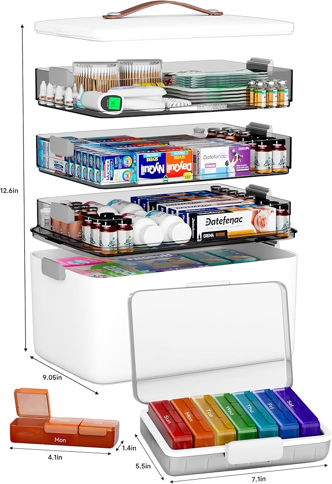 - [Medicine Organizer Set]Crafted from premium BPA-free, odorless ABS and PP plastics, this medicine storage set ensures lasting durability and family safety. It includes a high-capacity 4-layer chest and a 7-day organizer with a triple-protection system—featuring a silicone seal, snug case, and secure lock—to effectively guard against moisture and leakage, keeping medications perfectly dry.