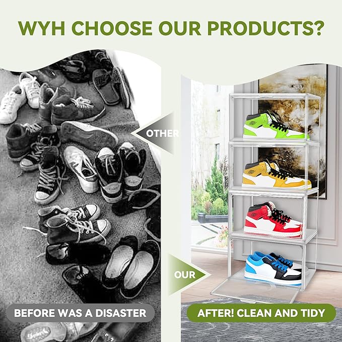 - Stackable and Sturdy:The shoe box is made of high-quality environmentally friendly plastic with good toughness and strength.It can withstand a certain pressure, not easy to crack, to ensure that in the stacking process, the lower shoe box will not be damaged by the upper pressure