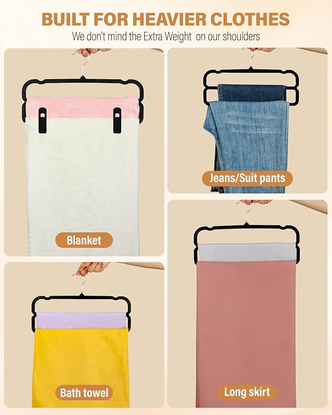 - Space Saving Closet Organizers:A set includes 10 velvet hangers with clips. Each felt hanger can hold up to 6 pairs of pants, for a total of 60 pairs. Use WJWSKI velvet pants hangers with double non slip bar. Make use of the vertical space in the wardrobe.