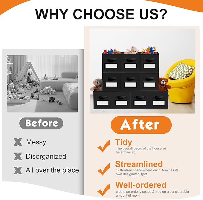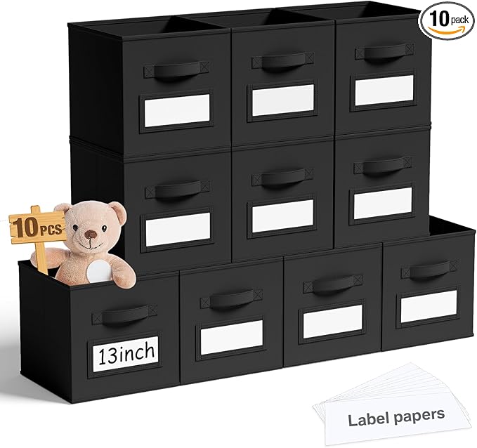- Black Color: you will get 10 pcs black fabric cube storage organizers with label cards, they are 13" L x 13" W x 13" H, the proper size will fit in your cabinets, and blend in with room decor while keeping items orderly