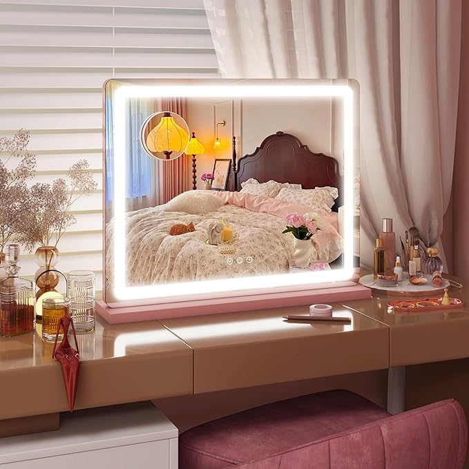 FENNIO 23" x 18" Vanity Mirror with Lights,LED Makeup Mirror,Hollywood Mirror with 3 Color Modes & Adjustable Brightness,Vanity Mirror Pink