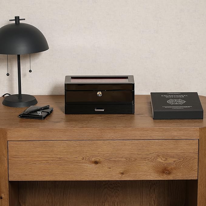 - ARTISAN-CRAFTED PIANO BLACK FINISH: Each box begins with a solid wooden frame and undergoes a meticulous 12-step process to achieve its signature piano black finish. Multiple layers of high-gloss lacquer are carefully applied, sanded, and left to cure. Once cured, the case gets wet-sanded and buffed/polished until it achieves a high-gloss mirror shine. The interior is then lined with ultra-soft microsuede, each step meticulously completed by hand with exceptional attention to detail.