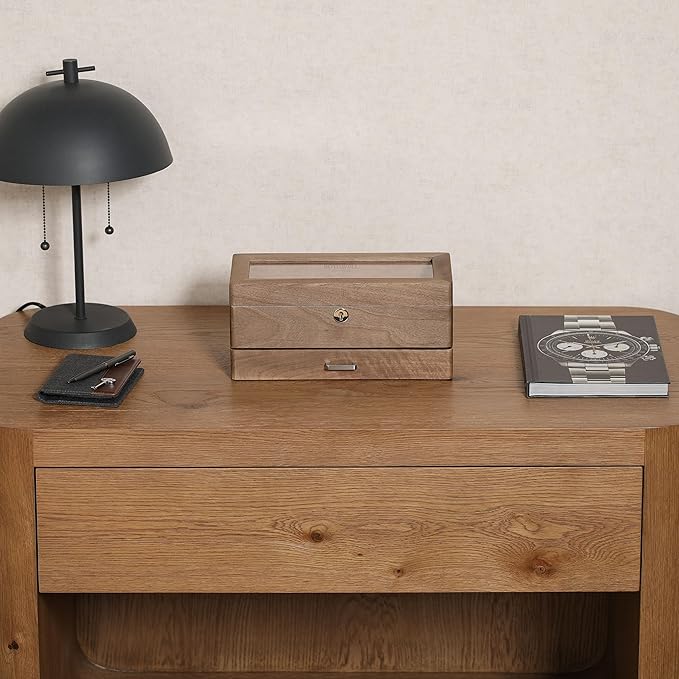 - MODULAR VALET DRAWER: The bottom drawer of this exquisite watch case features two removable modules for ultimate organization. The first module offers two compartments, ideal for cufflinks, tie bars, extra watch parts, or other fine jewelry. The second module is perfectly sized for rings, earrings, or small valuables. Even with both modules in place, the drawer easily holds reading glasses, sunglasses, or a wallet/checkbook, making it a versatile nightstand or desk organizer.