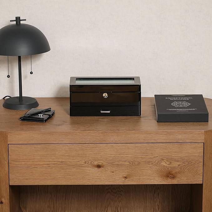 - ARTISAN-CRAFTED PIANO BLACK FINISH: Each box begins with a solid wooden frame and undergoes a meticulous 12-step process to achieve its signature piano black finish. Multiple layers of high-gloss lacquer are carefully applied, sanded, and left to cure. Once cured, the case gets wet-sanded and buffed/polished until it achieves a high-gloss mirror shine. The interior is then lined with ultra-soft microsuede, each step meticulously completed by hand with exceptional attention to detail.
