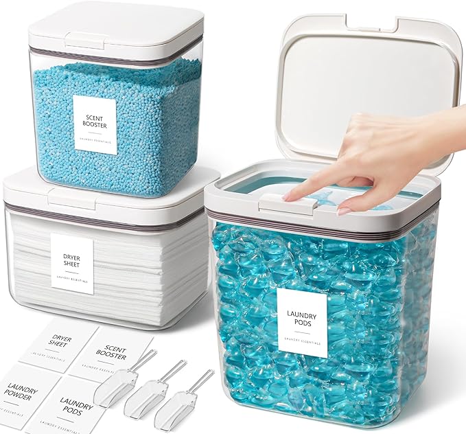 - 【Versatile 3-Size Set Fits Any Laundry Need】This set comes with 3 laundry containers for laundry room organization, 3 scoop and 4 decorative labels. A large-capacity laundry pods container will meet your needs for storing laundry pods at one time. Stackable design saves cabinet/counter space while keeping everything neatly organized and accessible.
