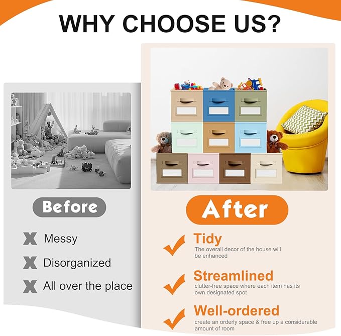 - Macaron Color: you will get 10 PCS macaron colorful fabric cube storage organizers with label cards, they are 10½" L x 10½" W x 11" H, the proper size will fit in your cabinets, and blend in with room decor while keeping items orderly