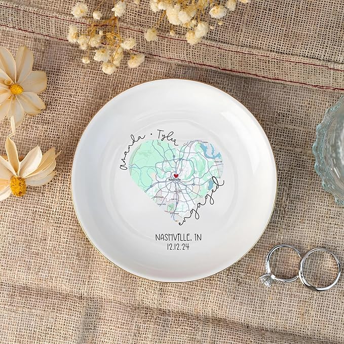 Chillever Custom Map Engaged Trinket Dish, Location Engagement Gifts For Couple Jewelry Tray, Ring Dish, Newly Engaged Ring Holder Best Gift For Lover 2
