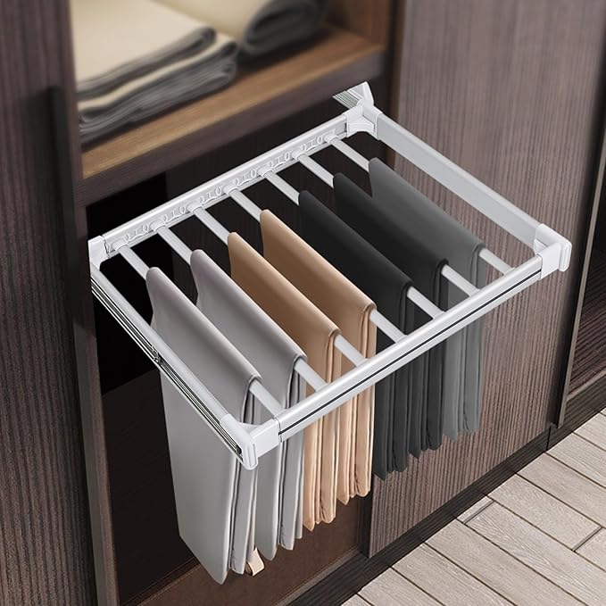- [Design] 3-Section silent sliding rail operates quietly and smoothly, allowing for easy pulling out of the wardrobe. The telescopic design maximizes the use of your wardrobe space. The enclosed slot design enhances the installation stability of the hanging rod, preventing it from easily falling off. The simple structure and detachable trouser rod design make it easy to clean. The triangular structure enhances the product's stability. You can also use it as a concealed clothes rack above the washing machine, freeing up more storage space in your home.